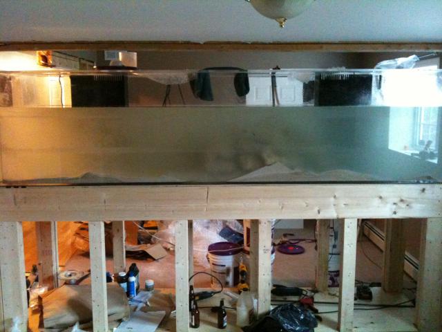 Day 2 - Filled to nearly 300 gal, mixed salt, install a few powerheads and filters, added heaters to get temp. up, added enough sand to just cover the bottom, and mixed in some chemicals.