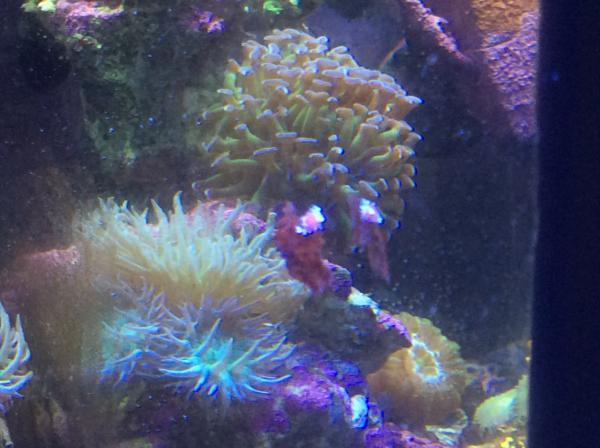 The corals you see are actually reflections in the side glass, which is why they look so blurry. The critter is on the inside. If I see it again, it's taking a baster ride to the drain! |