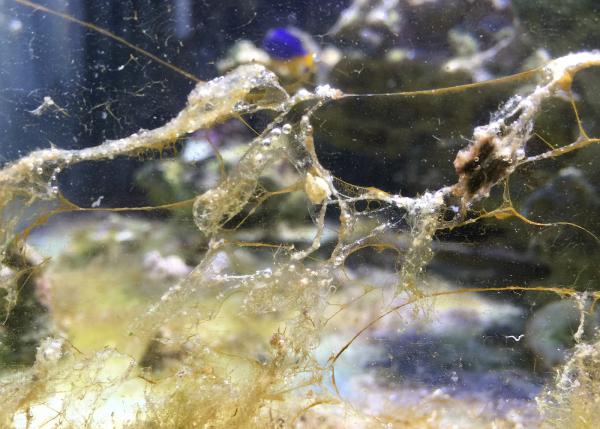 Hi everyone, I could use the help of a more experienced reefer. I've seen dinos, I've seen cyano, I've seen nuiscance algae, and I've seen this stuff (for longer than I would like). I'd appreciate some help IDing it so I can determine how best to deal with it. I know I have a phosphate problem, despite bleach and acid bath of nearly all my rock it's still leaching P at a stupid rate. I'm trying to get that under control and while I've halted growth of most algae and no visible cyano, this junk still proliferates. I clean it off the glass and within a day or two it's back and forms on all surfaces, where it's thicker it's a brown color. Slimy and stringy. Anybody know what I'm looking at?