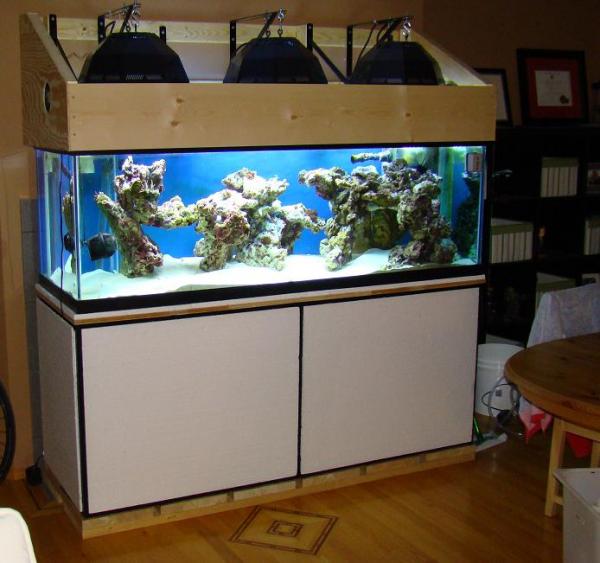 2x250w Ushio 10K MH PFO Ballast 6x54w T5HO 2 lamp Advanced Ballast's x3 3x40w Fans Waiting for my piece of glass to block splashing The reflectors are from a defective 4 lamp Cooper fixture, and im still thinking about getting individual reflectors on the MH's as well as mirrored plexie around the inside The 4 panels around the metal stand are held with magnet strips on 1x2 frames with 1/4" rock panel It may look ghetto but its better than my old fixture hanging from the celing and blinding me while im trying to watch TV. Whole Shot http://i468.photobucket.com/albums/r...n/IMG_0224.jpg Inside http://i468.photobucket.com/albums/r...n/IMG_0227.jpg Side http://i468.photobucket.com/albums/r...n/IMG_0222.jpg Front http://i468.photobucket.com/albums/r...n/IMG_0223.jpg Top 1 switch for attinics 1 switch for the other 4 T5's the MH's are hard wired to the ballast http://i468.photobucket.com/albums/r...n/IMG_0217.jpg |